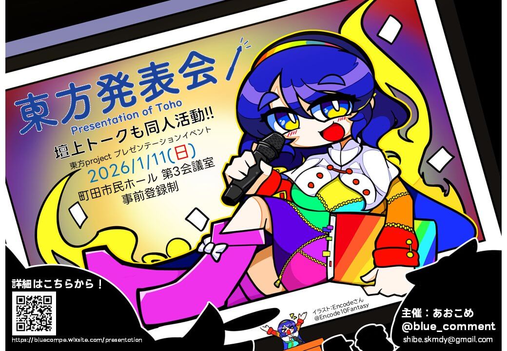 東京 第18回東方発表会 2026 1/04 期間限定 ALL イベント Favorite0 公式サイト等 開催日2026年1月11日概要東京で開催される東方projectのプレゼン発表イベントとなります。東方に対しての想いや新たな視点での考察等の発表機会となりますので、興味のある方はまずは気軽に参加してみましょう。開催場所町田市民ホール(東京都町田市森野2丁目2−36) (Googleマップ ) Favorite0 期間限定 ALL イベント よかったらシェアしてね! URLをコピーする URLをコピーしました! URLをコピーしました! コメント コメントするお名前 次回のコメントで使用するためブラウザーに自分の名前、メールアドレス、サイトを保存する。 コメント内容※このサイトはreCAPTCHAによって保護されており、Googleの プライバシーポリシーと 利用規約が適用されます。 上に表示された文字を入力してください。このサイトは reCAPTCHA によって保護されており、Google のプライバシーポリシー および 利用規約 に適用されます。reCaptcha の認証期間が終了しました。ページを再読み込みしてください。